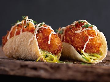 Dos tacos crujientes estilo vietnamita con camarones al coco, ensalada de mango, kanikama y wakame.
