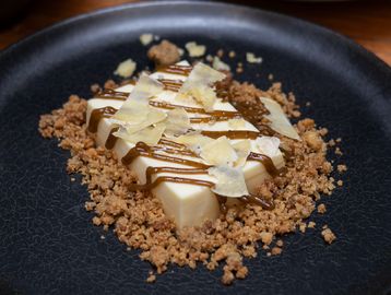 Cheesecake de mascarpone y queso crema, sobre base de galleta de mantequilla, bañado con caramelo y miso.